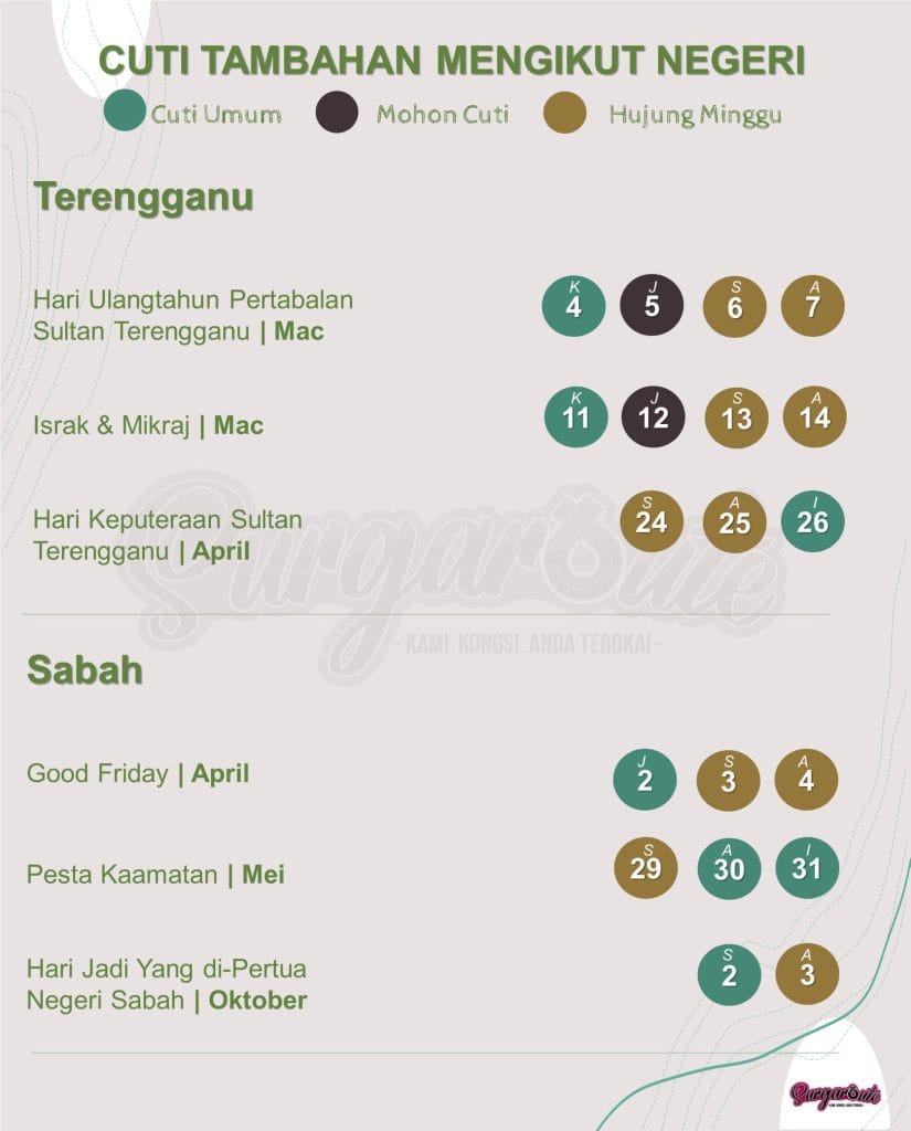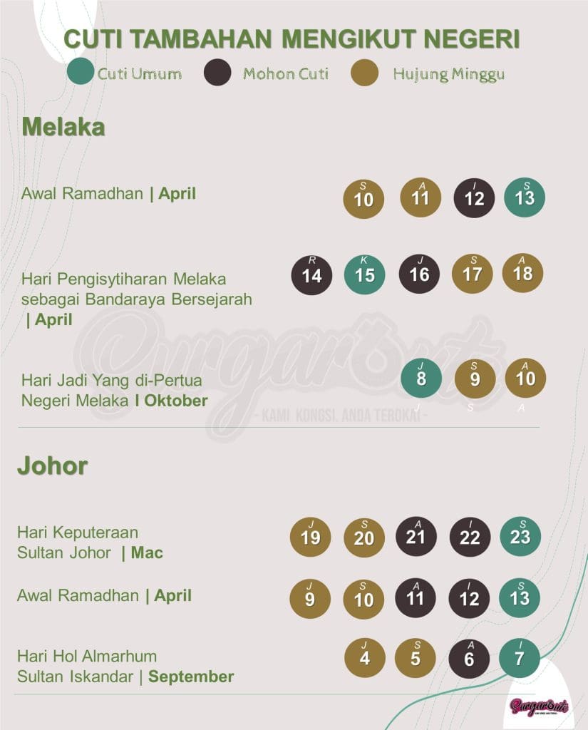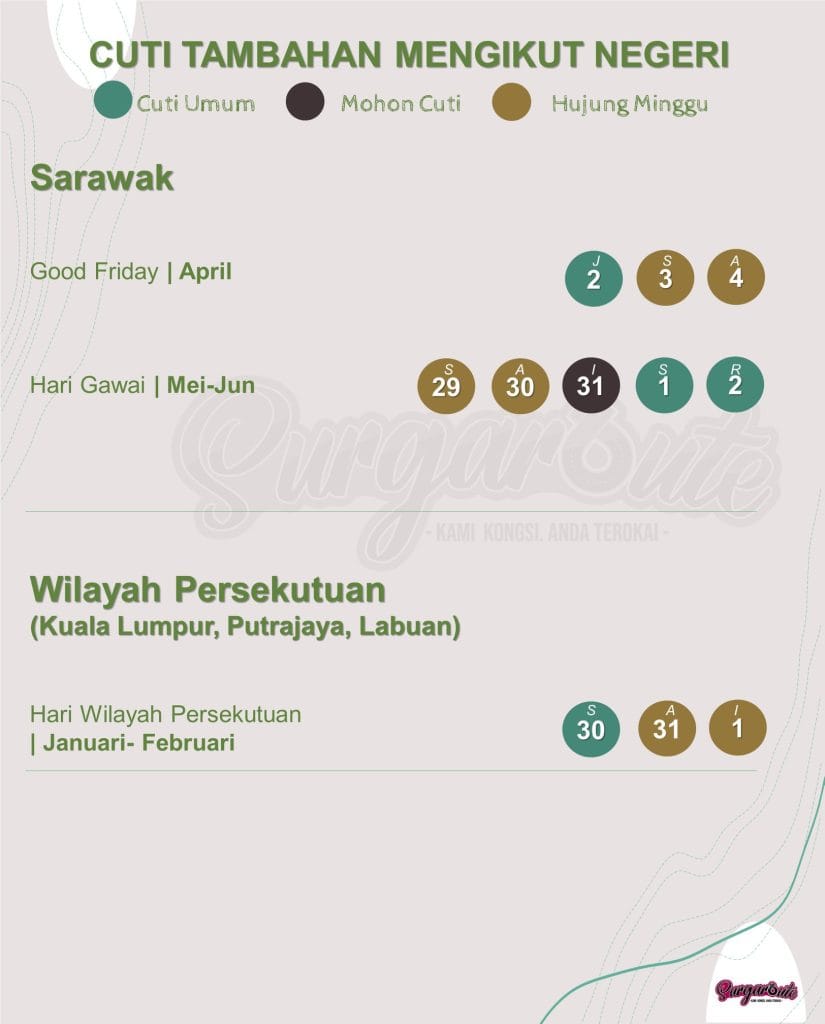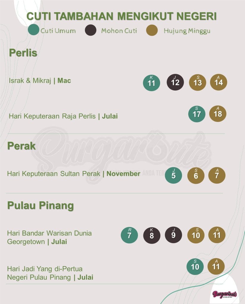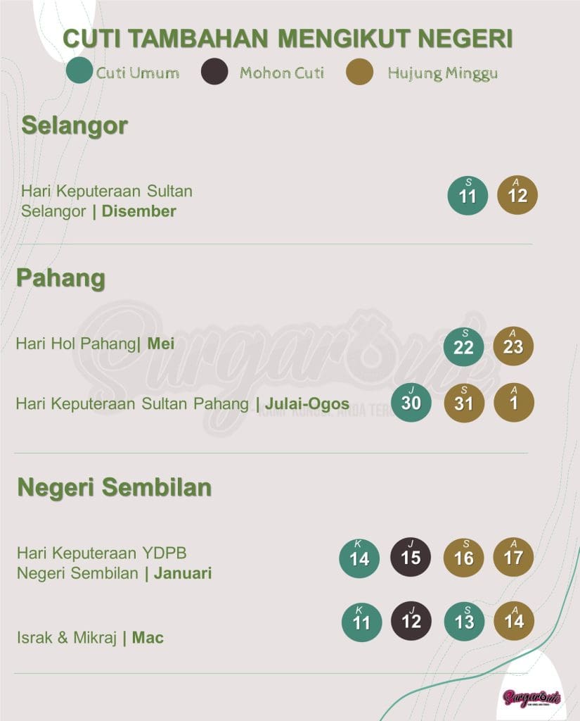 Sebagai tambahan kepada cuti umum seluruh negara, anda yang tinggal di negeri-negeri tertentu juga dapat menikmati cuti umum tambahan yang lain!