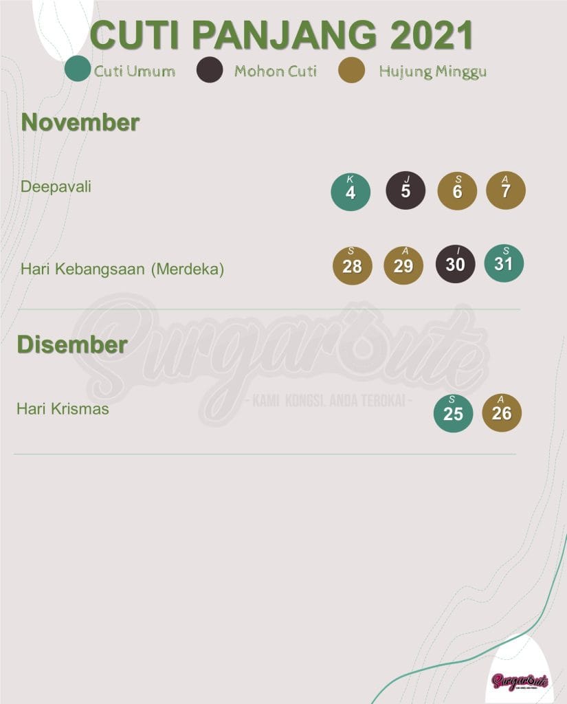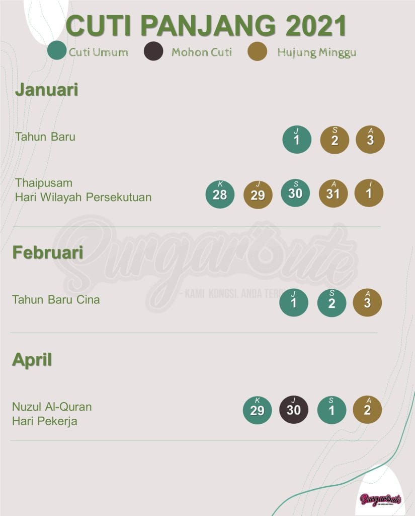 Tetapi, itu tidak bermakna kita tidak boleh berharap untuk menikmati cuti panjang , apatah lagi sektor pelancongan domestik telah dibuka. Jadi, kita tetap boleh menggunakan 14 cuti umum pada 2021 ini !