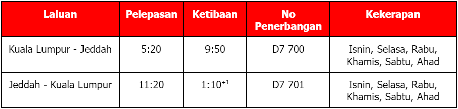 Tambang penerbangan dari Kuala Lumpur ke Jeddah bermula RM 1,629 sehala untuk tempat duduk Ekonomi atau tetamu boleh memilih untuk menikmati tempat duduk Premium Flatbed mulai RM 3,199 sehala. Penumpang boleh membuat tempahan dengan menekan ikon ‘Flights’ pada aplikasi airasia Super App atau menerusi laman web bagi tempoh penerbangan mulai sekarang sehingga 30 November 2023. Perkhidmatan tambahan untuk musim baharu akan ditambahkan kepada jadual penerbangan dalam tempoh terdekat ini.